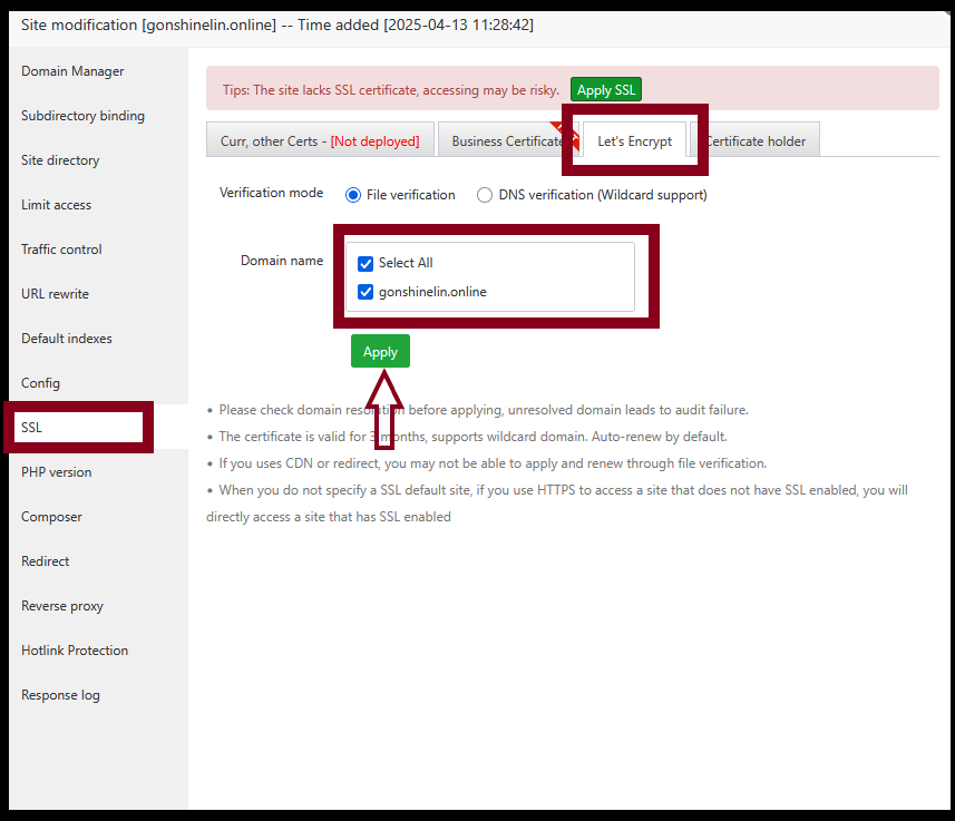 Step3. Select Let's Encrypt. Tick Select All and press Apply.