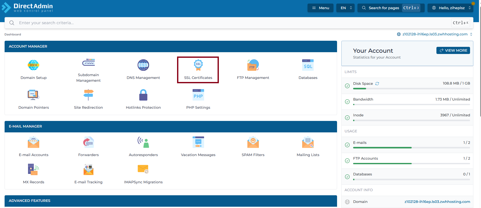 Step 2: Login to the Direct Admin dashboard under the Web Hosting Tab