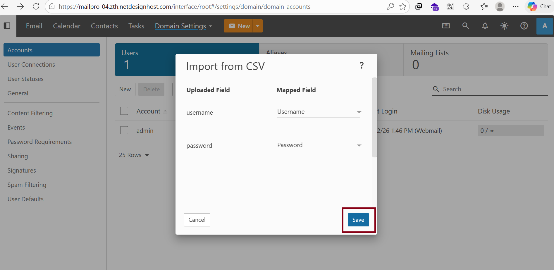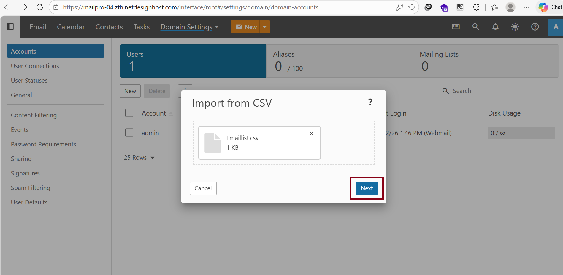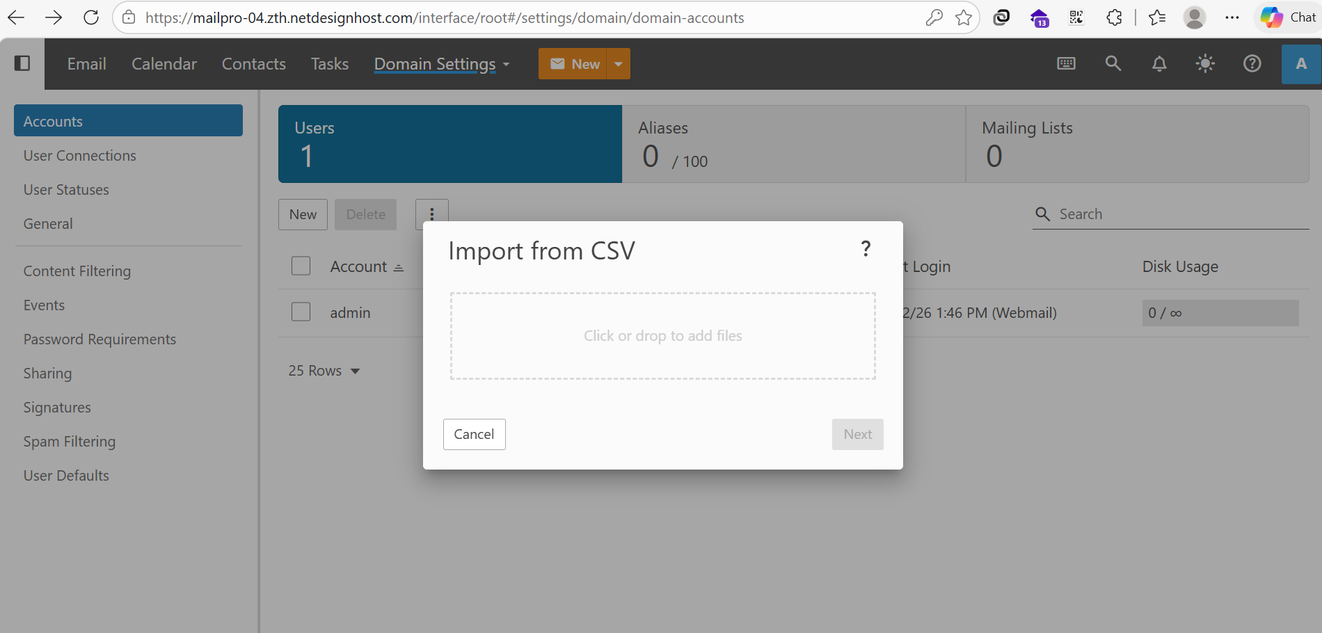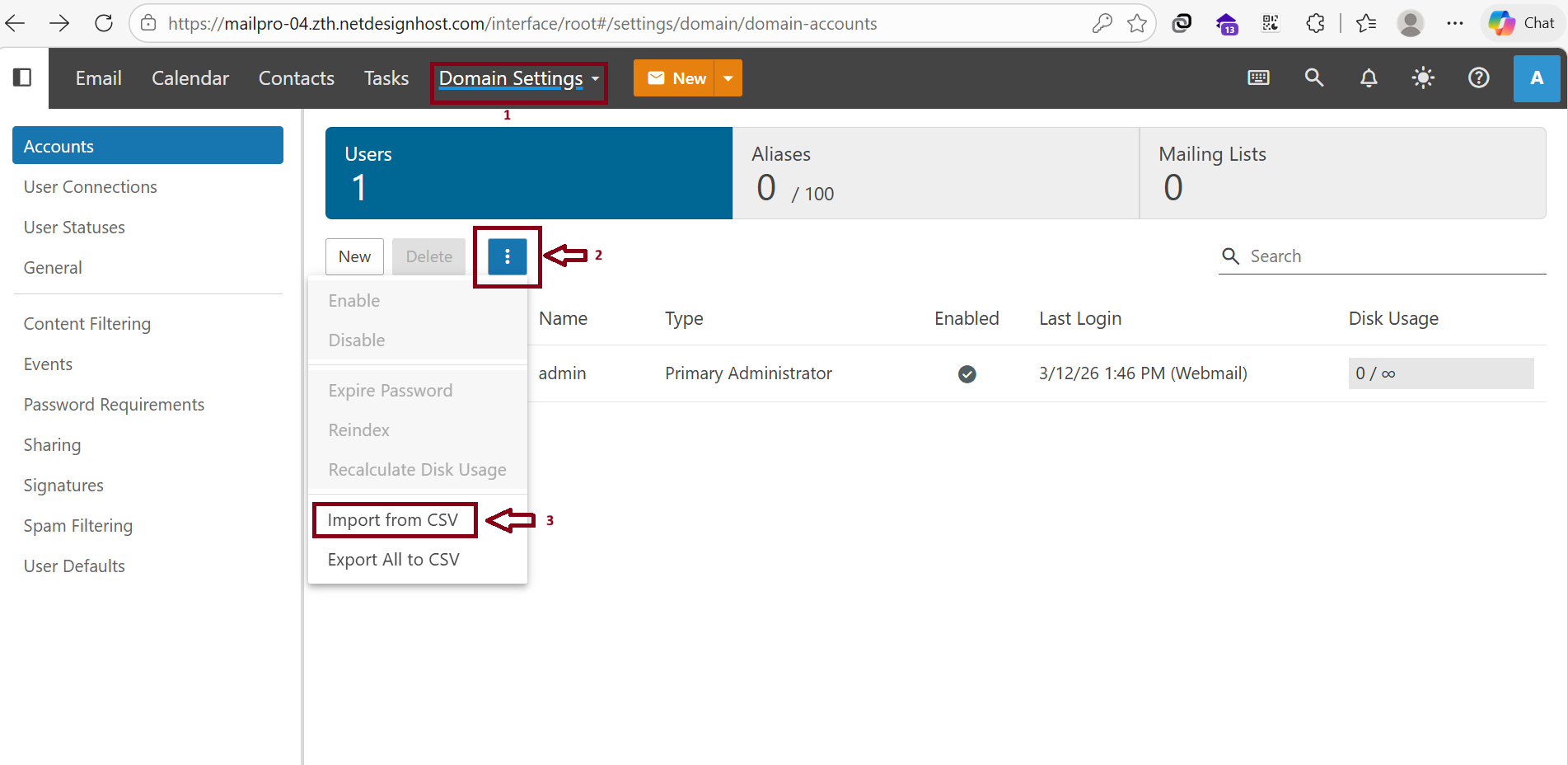 Go to “ Domain Setting ” and Click “3 dots”. Now we can import CSV files for multiple email account creation processes so Click “Import from CSV“