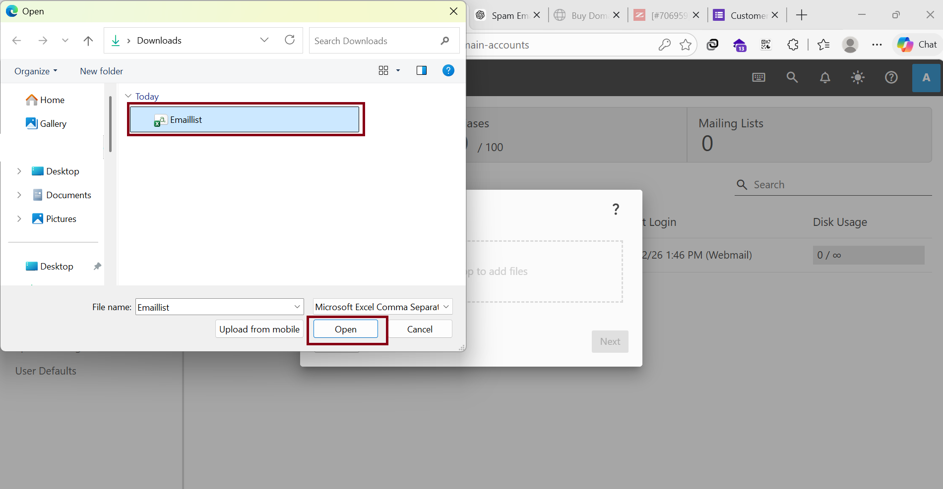 Please create an Excel file first on your local PC. In this file, please add email list that you want to create accounts.
