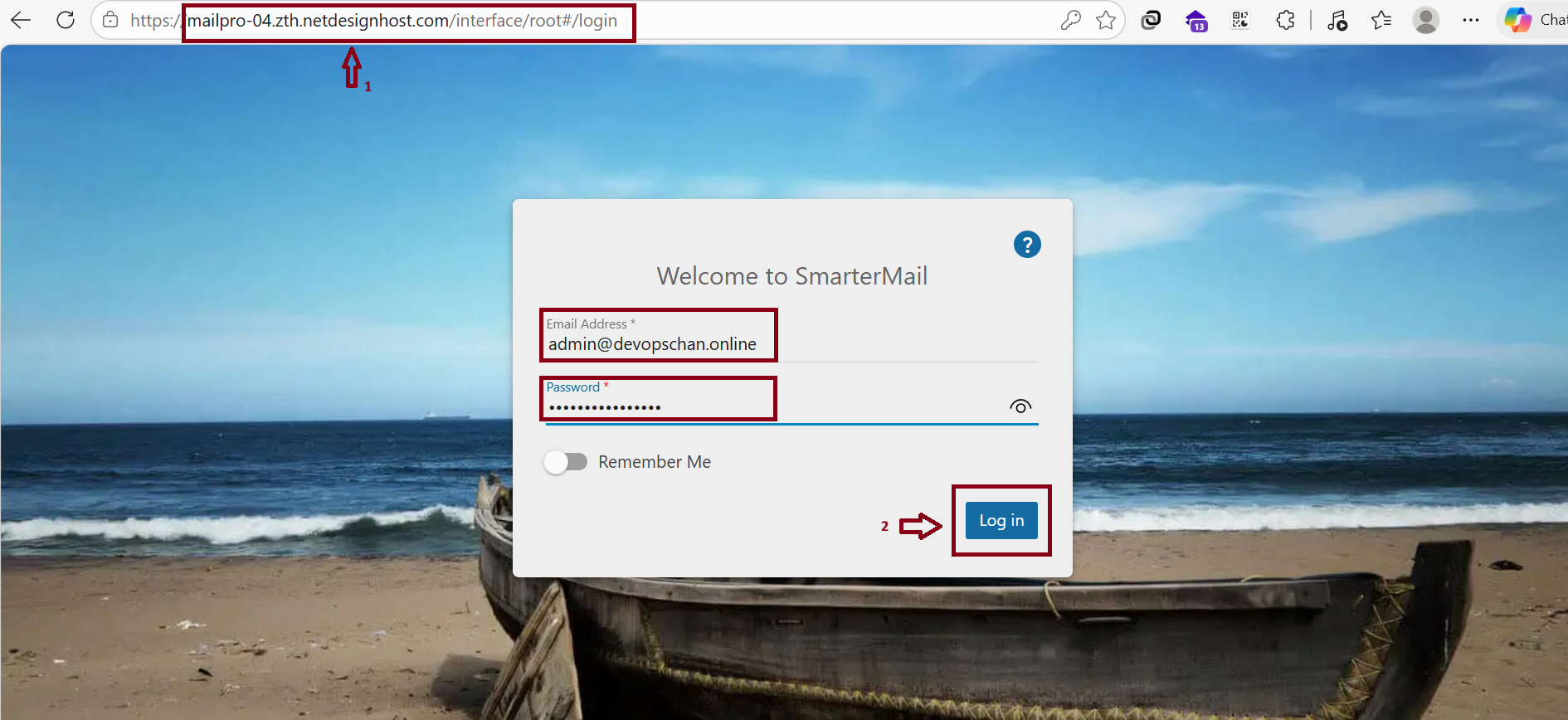 Use a web browser and enter these credentials to log in to your SmarterMail dashboard.