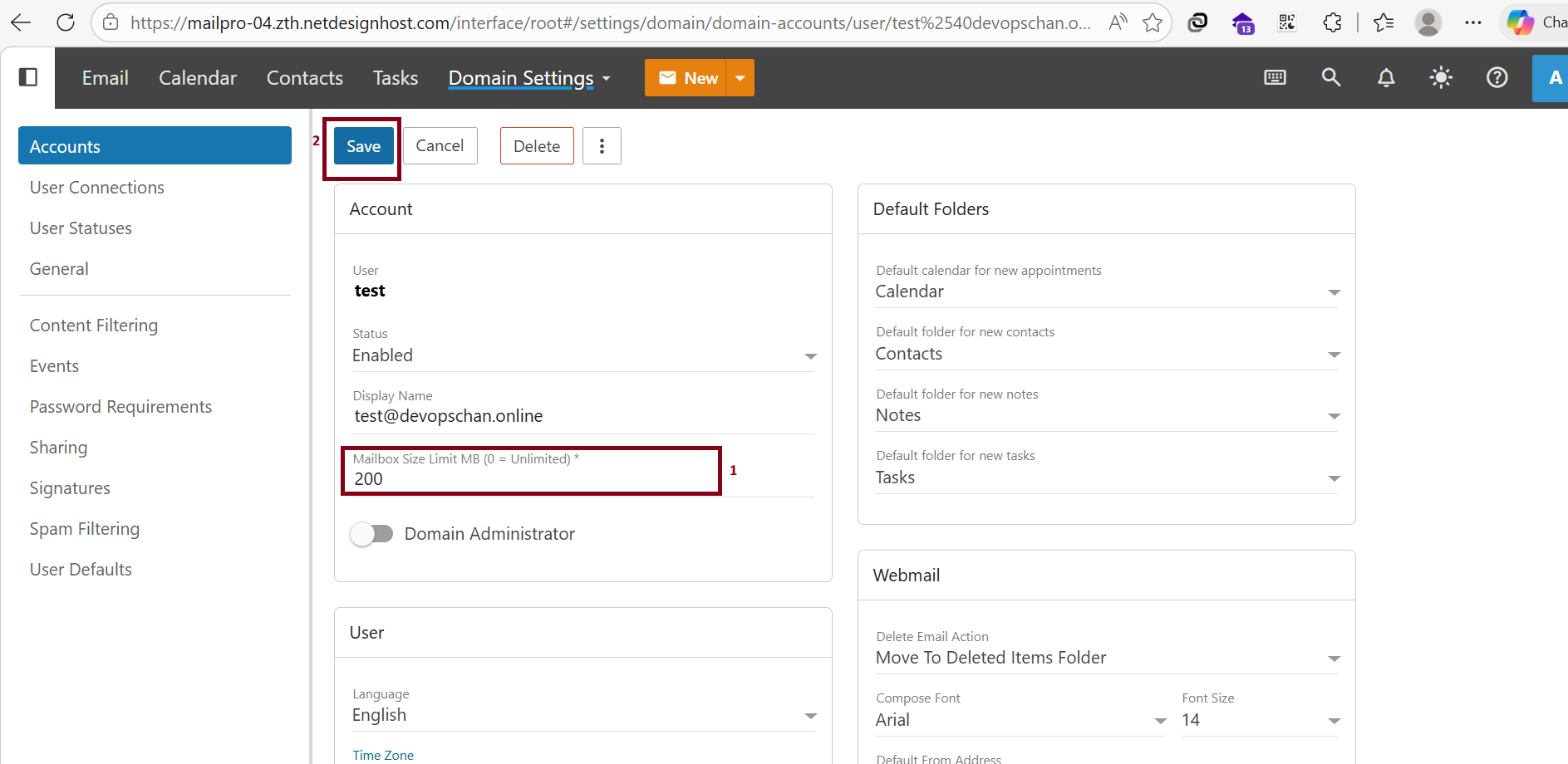 The result below shows the successfully updated the Mail Account Storage after increasing the limit to 1000MB .
